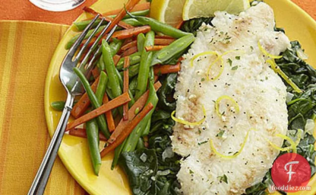 पालक के साथ नींबू-लहसुन उबला हुआ फ्लाउंडर