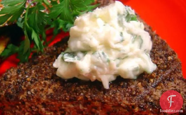 अजमोद-लहसुन मक्खन के साथ काली मिर्च-ग्रील्ड टूना स्टेक
