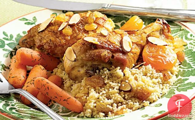 पैकेज निर्देशों के अनुसार कूसकूस तैयार करें । प्लेटों पर चम्मच, चिकन और रस के साथ कवर करें ।