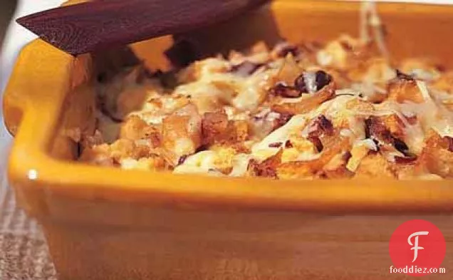 1/2 कप पनीर के साथ छिड़के, और शेष रोटी मिश्रण के साथ शीर्ष । स्ट्रैट को कवर करें, और 8 घंटे या रात भर ठंडा करें ।