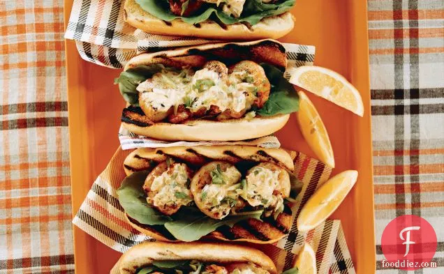 हॉट डॉग रोल के कटे हुए किनारों को जैतून के तेल से ब्रश करें और टोस्ट होने तक ग्रिल करें ।