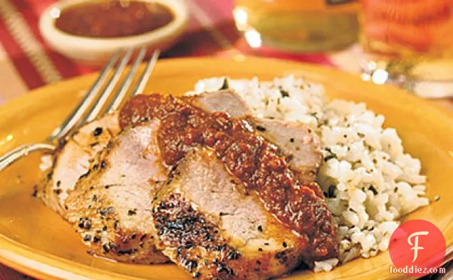 चिली-त्वरित तिल सॉस के साथ पोर्क टेंडरलॉइन रगड़ा
