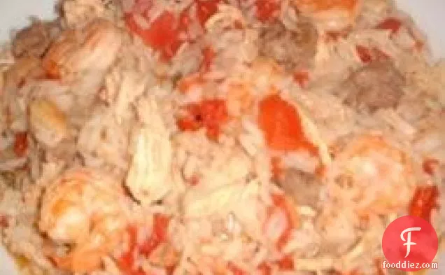 इलेक्ट्रिक स्किलेट के लिए मध्यम-उच्च सेटिंग का चयन करें; गर्म स्किलेट में तेल गरम करें । नरम होने तक तेल में प्याज पकाएं । टमाटर, चिकन और सॉसेज में हिलाओ । लहसुन पाउडर, गर्म सॉस, नमक और काली मिर्च के साथ सीजन । चावल में हिलाओ, शोरबा में डालना, और झींगा जोड़ें ।