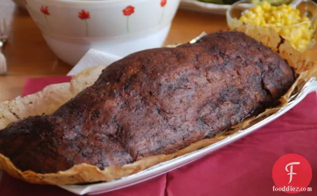 रोस्ट के पूरे शीर्ष को मैरिनेड से ब्रश करें । (बचे हुए मैरिनेड को बाद में चखने के लिए रख दें । ).यदि संभव हो तो किसी को लपेटने में मदद करें । बेकिंग पेपर की सभी परतों के साथ लपेटें । बंद करने के लिए लंबे सिरों को मोड़ें । यदि वांछित हो तो बेकिंग पेपर की एक अतिरिक्त परत के साथ लपेटें । पन्नी की कई परतों के साथ फिर से लपेटें । धीरे से बेकिंग ट्रे पर रखें ।