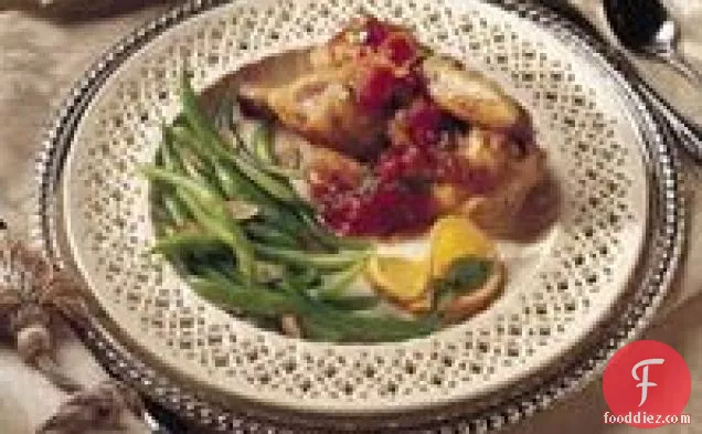 टमाटर-नारंगी सॉस के साथ ग्रील्ड कोर्निश मुर्गियाँ