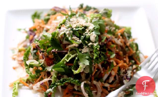 नारंगी के साथ भुना हुआ तिल शीतकालीन स्लाव और ताहिनी क्रीम ड्रेसिंग