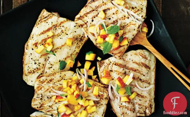 खाना पकाने के स्प्रे के साथ लेपित ग्रिल रैक पर सीधे गर्मी पर मछली, त्वचा की तरफ नीचे रखें; 2 मिनट ग्रिल करें । मछली को पलट दें और अप्रत्यक्ष गर्मी पर आगे बढ़ें; 12 मिनट या दान की वांछित डिग्री तक ग्रिल करें । आड़ू मिश्रण में टकसाल हिलाओ ।
