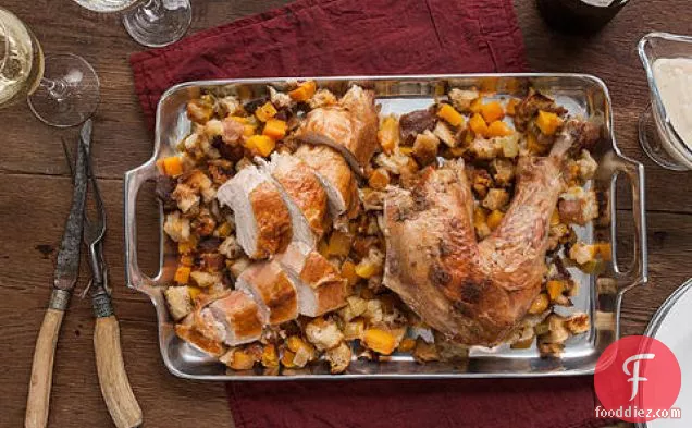 बटरनट स्क्वैश स्टफिंग के साथ बटरफ्लाइड भुना हुआ टर्की
