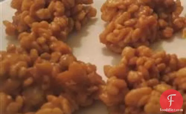 गर्मी से निकालें । कुरकुरा चावल अनाज में हिलाओ। लच्छेदार कागज या पन्नी पर गोल चम्मच द्वारा गिराएं । फर्म तक ठंडा करें ।