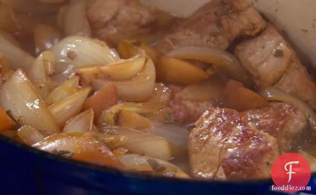 ब्राउन किए हुए मांस को एक प्लेट में निकालें और पैन में मक्खन जोड़ें । गर्मी को थोड़ा कम करें और प्याज, सेब, बे पत्तियों और ऋषि जोड़ें । नमक और काली मिर्च के साथ सीजन और 12 से 15 मिनट के लिए प्याज को पसीना करने के लिए पैन को कवर करें, कभी-कभी सरगर्मी करें । बर्तन को उजागर करें और गर्मी को थोड़ा बढ़ाएं । जब प्याज ब्राउन होने लगे, तो बर्तन में कैल्वाडोस डालें ।