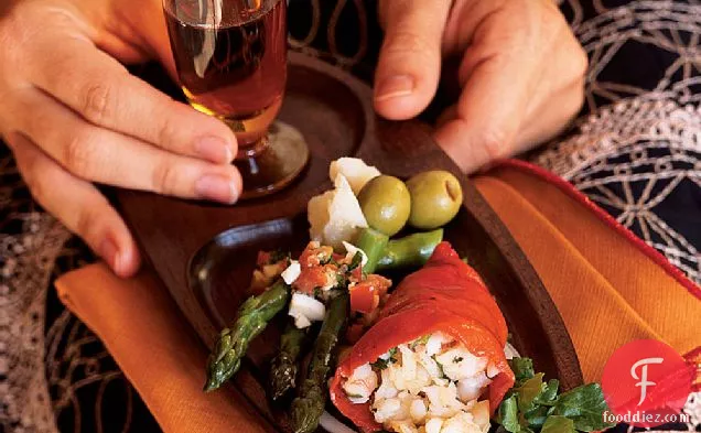 शेरी विनैग्रेट में झींगा से भरी पिकिलो मिर्च (पिमिएंटोस डेल पिकिलो कॉन टार्टर डी लैंगोस्टिनोस)