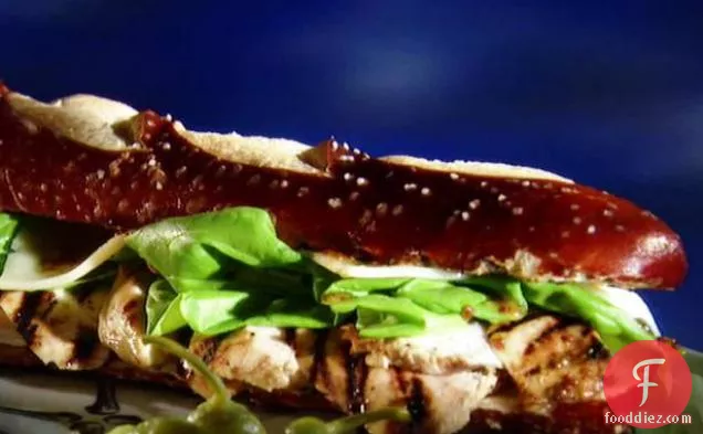 साइट्रस सरसों के साथ प्रेट्ज़ेल बैगूएट पर ग्रील्ड चिकन सैंडविच