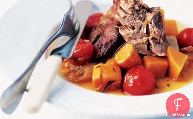 सब्जियों के साथ धीमी गति से पका हुआ भेड़ का बच्चा